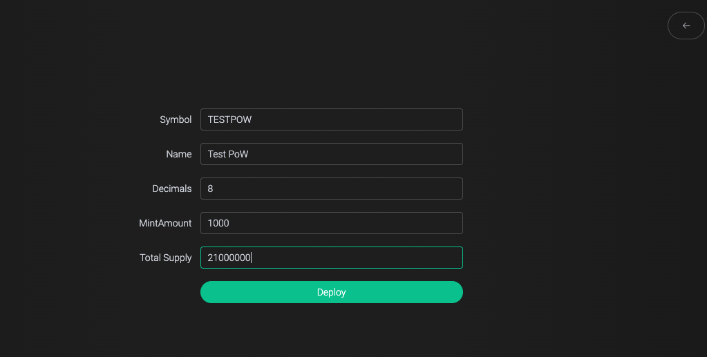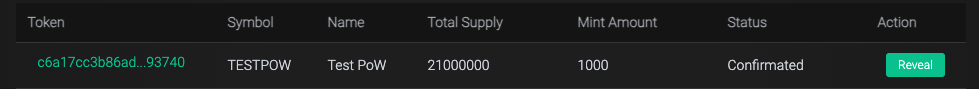 4. Once the token creation is complete, the deployer needs to reveal to deploy the token. The following example shows how to create a token called "TESTPOW".