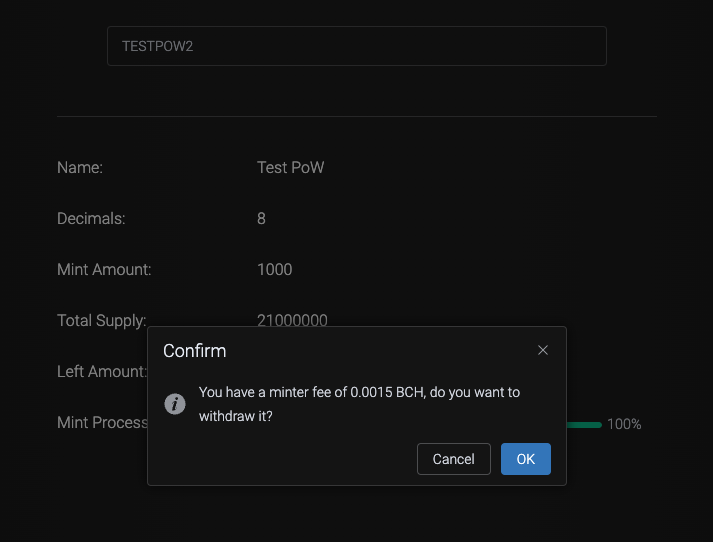 2. PoW Mining token you will be asked in a pop-up window whether you want to take the distributed fee.