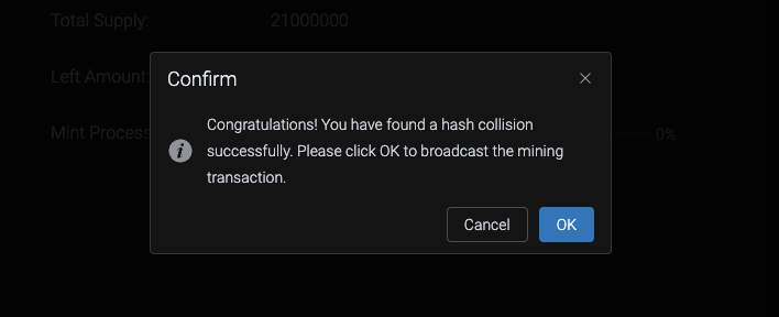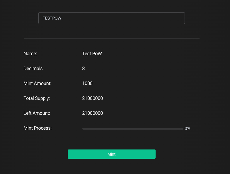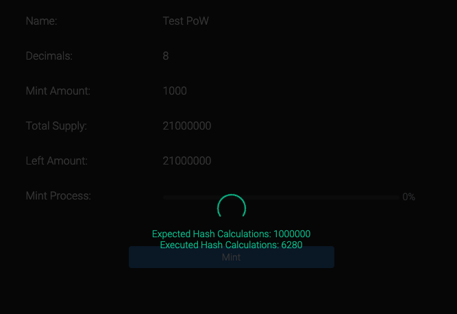 2. Click "mint" and start mining. After a proper nonce is calculated, you can mint successfully for one time. The more times you mint, the more proper nonces.