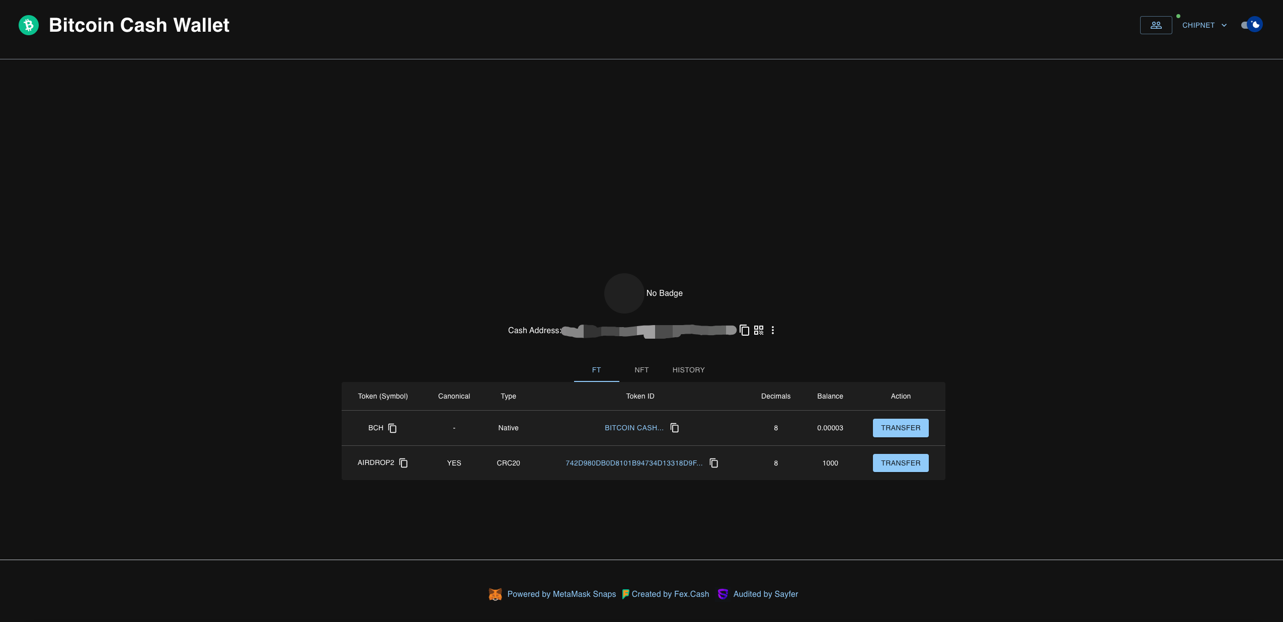 Fex currently offers two ways to connect to wallets, Pay4Best and Snaps. Pay4Best is quite simple, it is to generate a BCH cash address using the EVM address and then sign to confirm transactions. Snaps is a recently launched MetaMask feature designed to provide developers with a way to access the MetaMask wallet (especially for non-EVM blockchains). We have implemented a simple Snaps wallet called [bchwallet.cash](https://bchwallet.cash/).